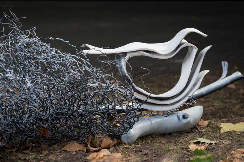 “An Imaginary Point” is an interaction of geometric and biomorphic forms, inspired by “Bicycle Eaten by a Tree”.