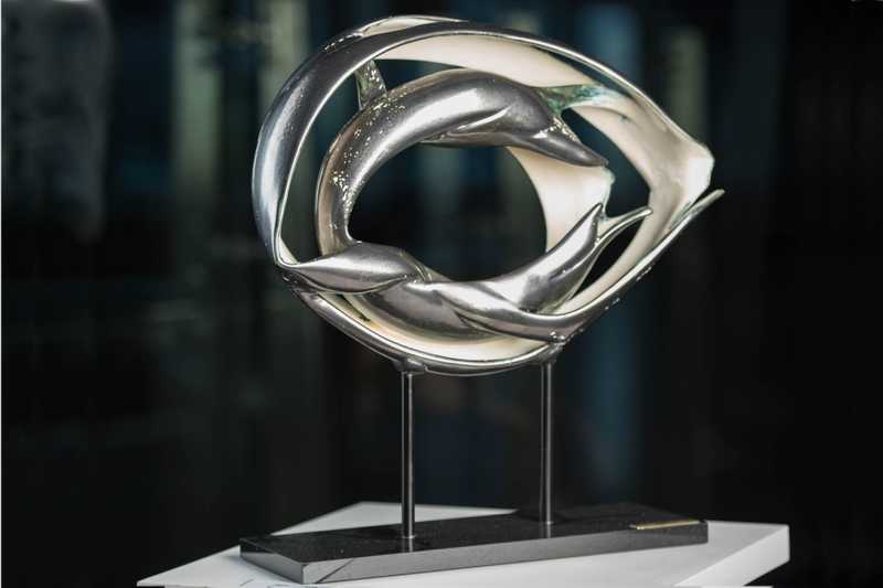 What is interesting about an abstract form is that we can see what we like to see. In the shape of this sculpture, the viewer either can see an eye or two dolphins.